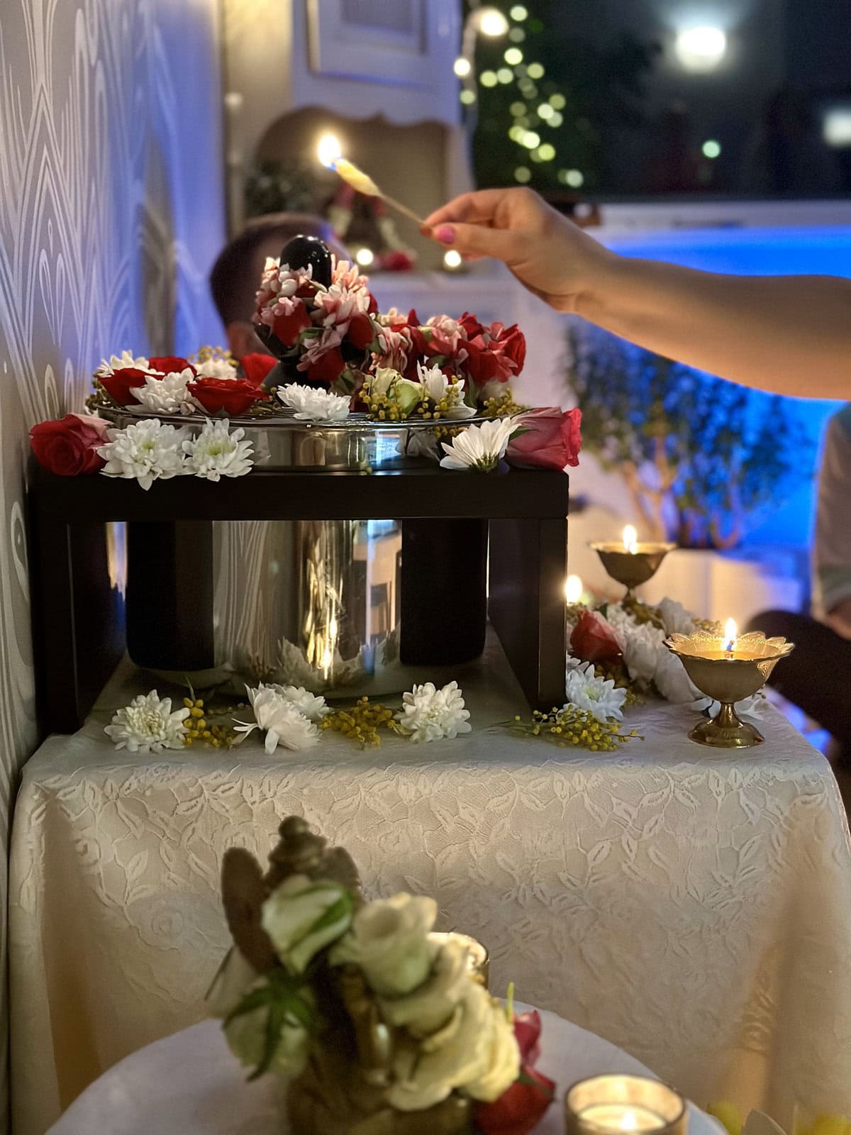 Ziedojuma summā ietilpst:telpu nodrošināšana, tiešsaistes translācija, visu rituālam nepieciešamo atribūtu iegāde (Ghī, piens, medus, ziedi, augļi, vīraks u.c.), ziedojums bramanim.